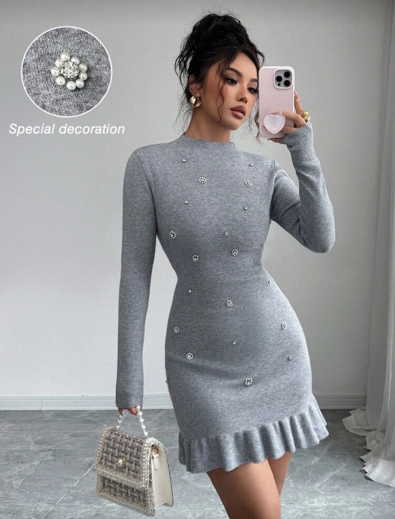 Be the first to review “New Knitted Diamond Studded Stand Collar Long Sleeve Fitted Elegant Ruffle Hem Women Sweater Dress”