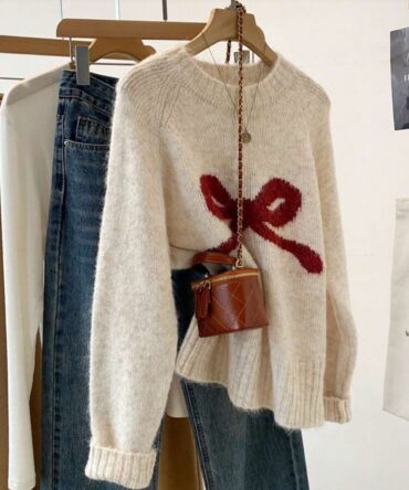 Bow Knit Pullover Sweater, Ribbed Crew Neck Cute Sweater For Women